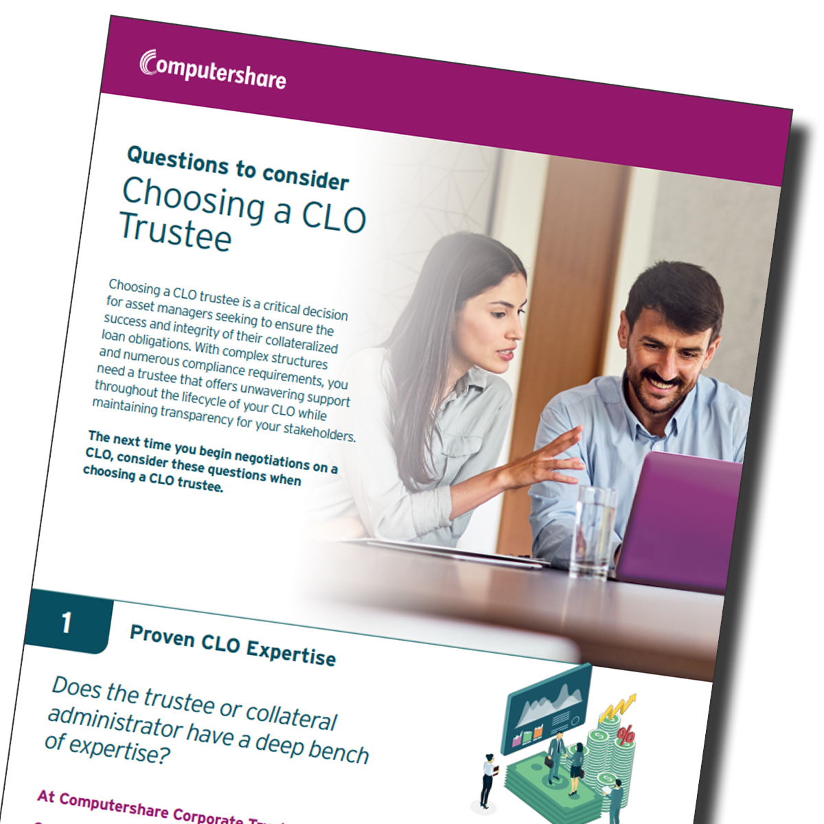 Computershare is among the top providers in the US ranking #1 in CMBS, CRE CLO and top 3 in RMBS, CLO, ABS, Convertible and High Yield Debt. With an extensive network of resources and long-standing relationships across the globe, Computershare is a financial and administrative partner who is able to innovate and grow along with you.